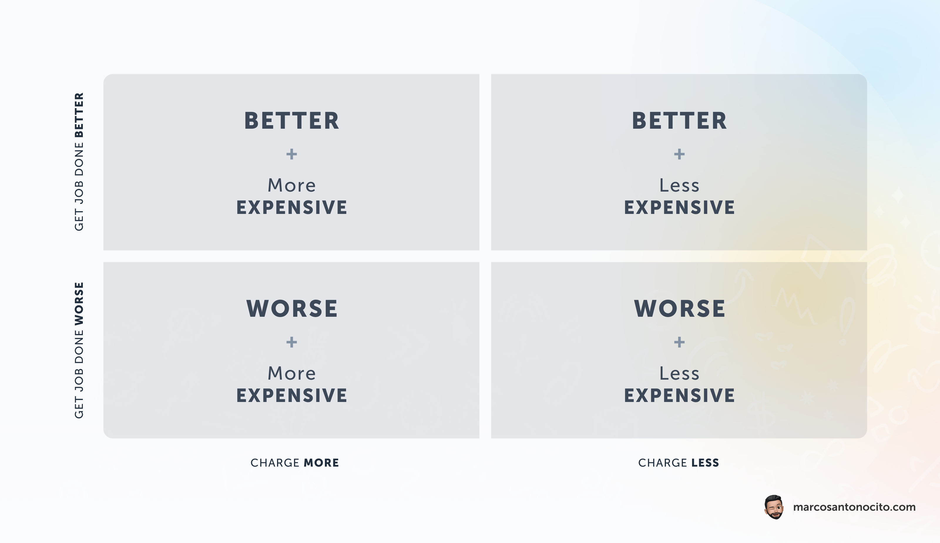 La matrice suggerisce che le aziende possono creare prodotti e servizi che sono (1) migliori e più costosi, (2) migliori e più economici, (3) peggiori e meno costosi oppure (4) peggiori e più costosi.