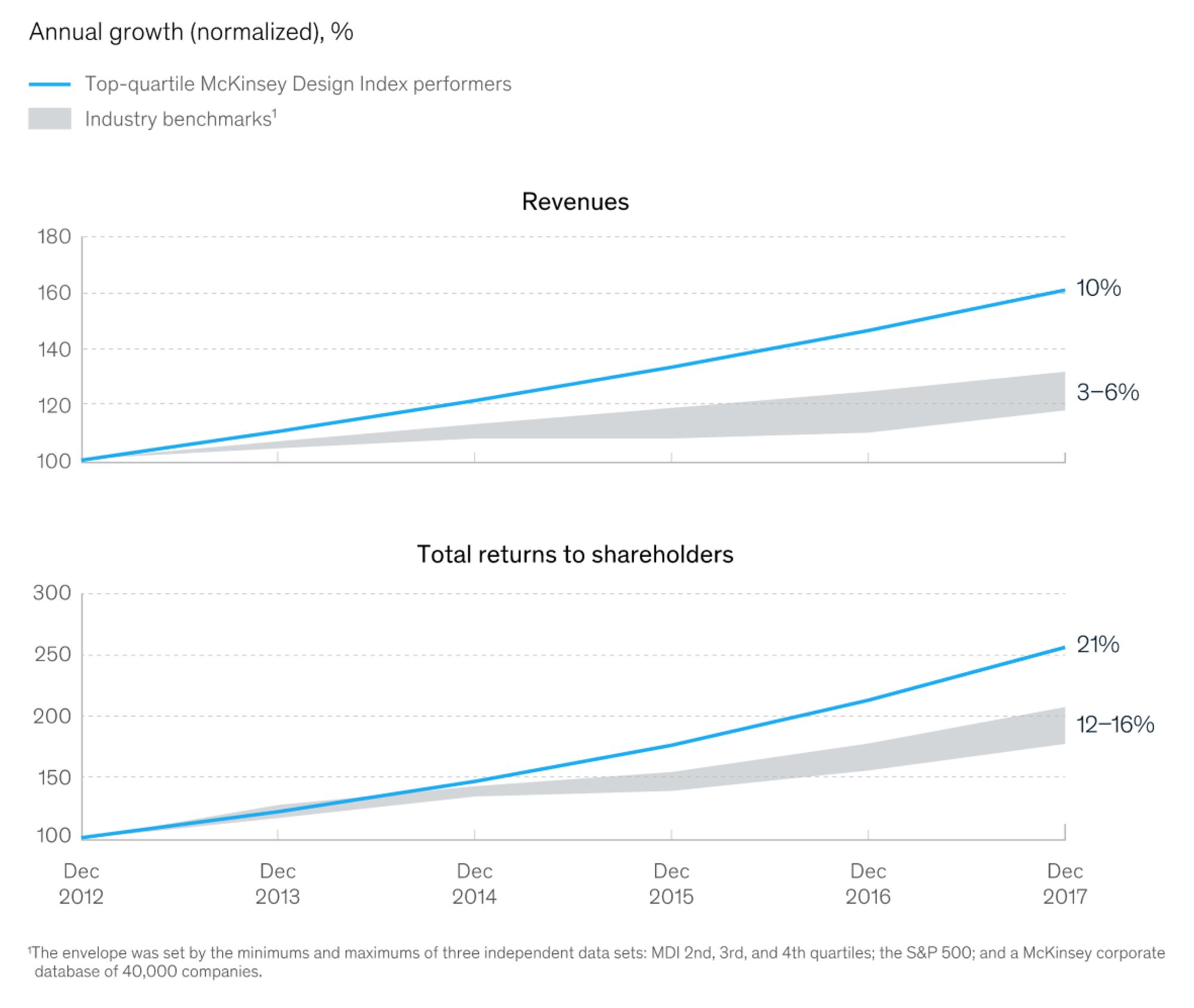 In breve, il potenziale di crescita per le aziende design-driven è enorme sia nel settore dei prodotti che in quello dei servizi.