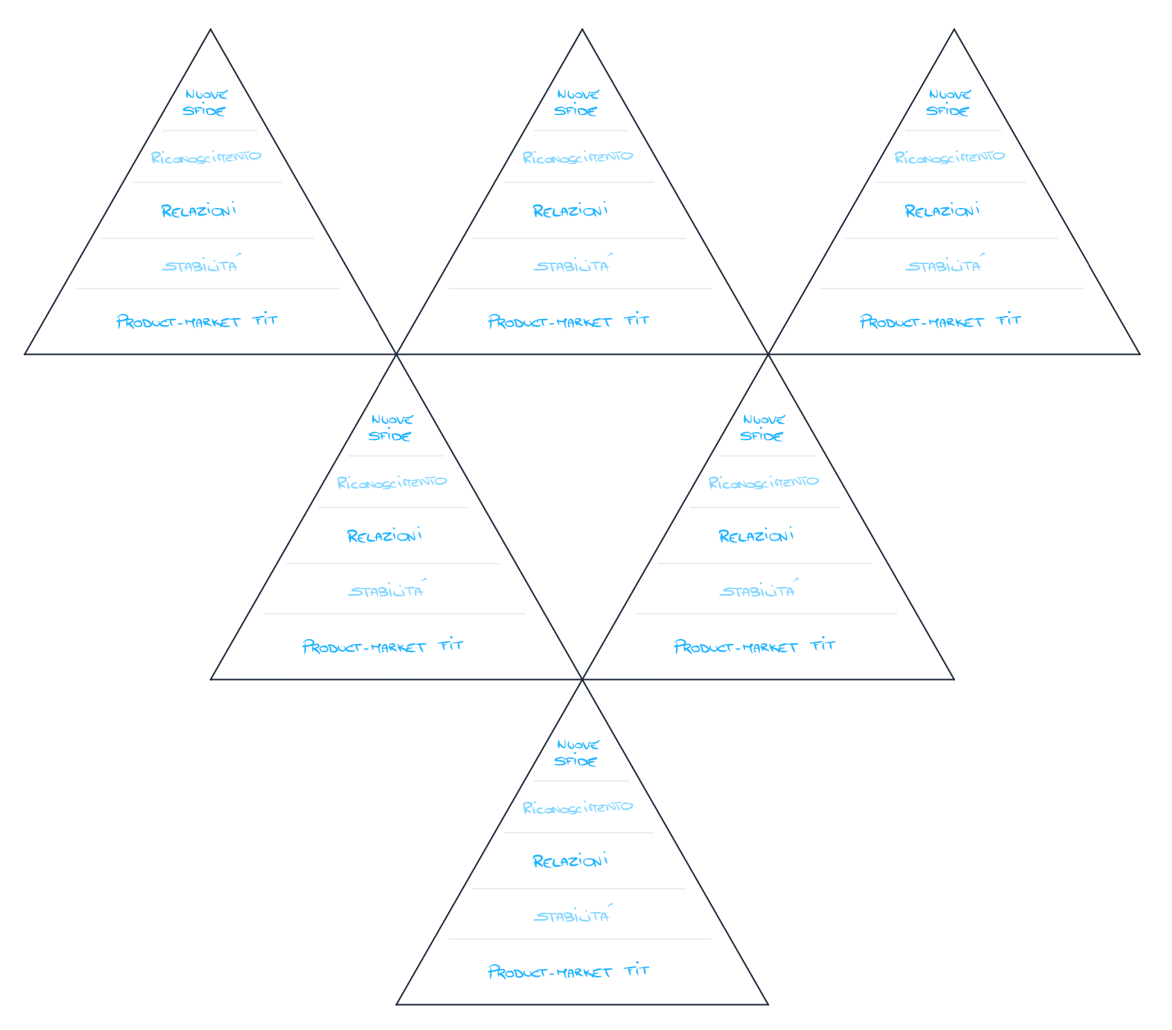 Essa non esiste più come azienda con un'idea geniale, ma si espande su più mercati, prodotti ed economie. A differenza della piramide di Maslow, nel contesto della startup, la parte superiore della piramide si apre in nuove piramidi, a significare un bisogno costante di innovare ed entrare in nuovi mercati e opportunità .