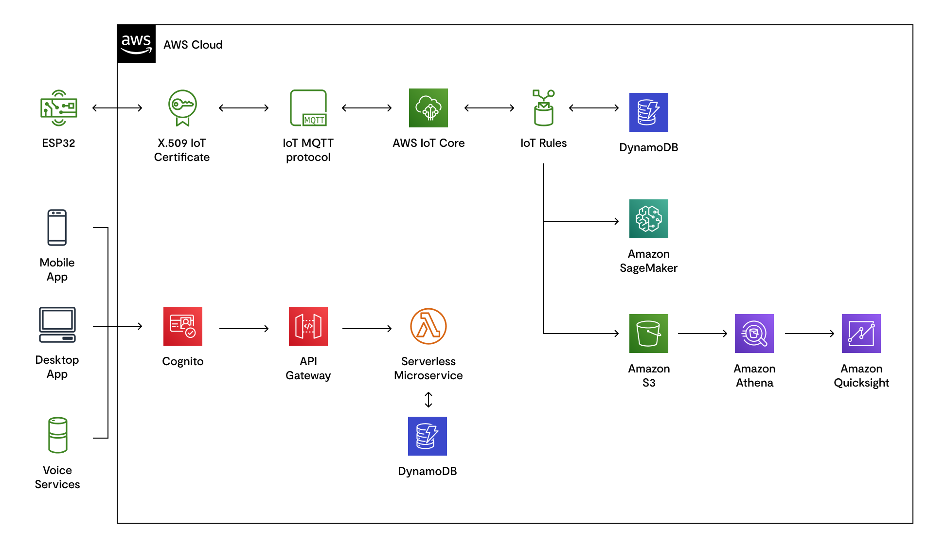 - AWS IoT per l'acquisizione di dati e la gestione dei dispositivi,